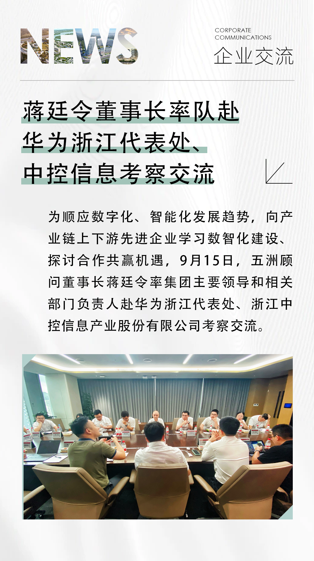 在华为浙江代表处,蒋董一行与华为浙江代表处相关负责人就智慧园区、智慧办公、数字咨询等智慧领域的行业标准、服务方案及未来趋势进行了深入交流与探讨,并就产业链合作方向进行了具体沟通。