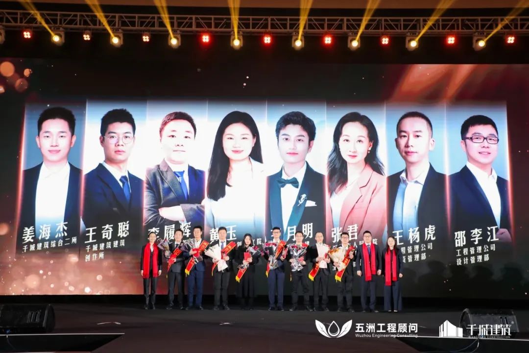 ▲集团执行总经理、千城建筑总裁董永贤,往届先进代表何让珍,监理公司总经理助理吴峻涛为优秀项目负责人、优秀总监理工程师获奖人员颁奖