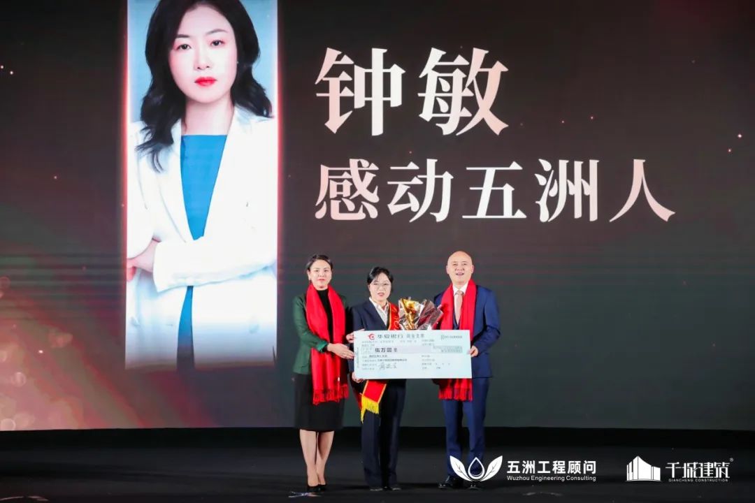 ▲集团董事长蒋廷令,投资控制顾问公司副总经理史君为感动五洲人——钟敏颁奖