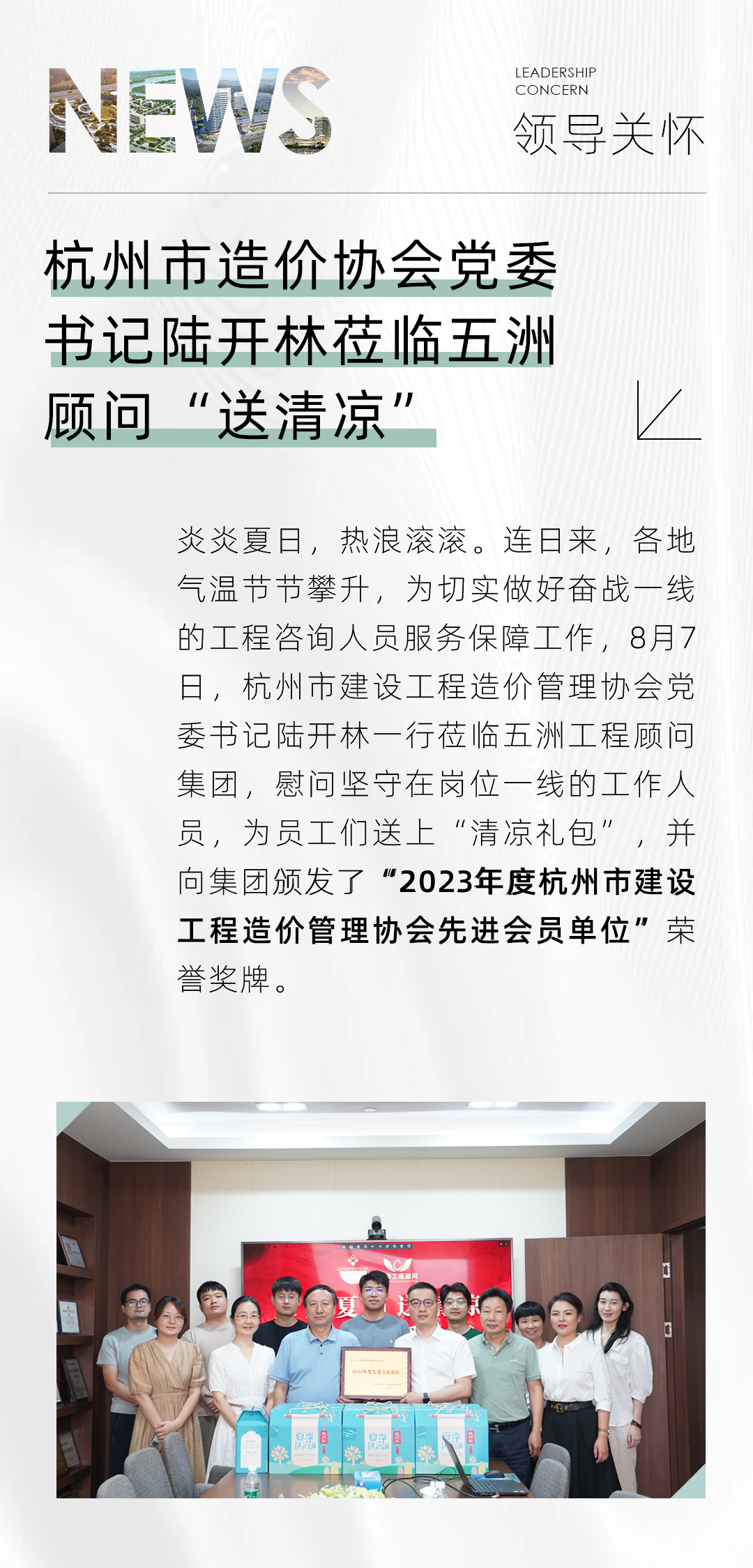 杭州市建设工程造价管理协会党委书记陆开林表示,市造价协会把“夏送清凉”当作一种传统延续至今,年年将“清凉”送到一线,增进协会与会员企业的联系,提升造价人员幸福感,也希望大家要做好防暑降温工作,确保高温时节各项工作平稳、有序开展。他指出,五洲顾问作为建筑咨询行业领头羊企业,在企业市场信誉、发展业绩、党建文化、社会公益等方面拥有优势,期待五洲顾问充分发挥企业品牌优势与先进会员单位带头作用,积极参与到协会的各项工作、融入到各项活动中,与其他会员单位多交流、多碰撞、多融合,共同推动造价咨询行业高质量发展。